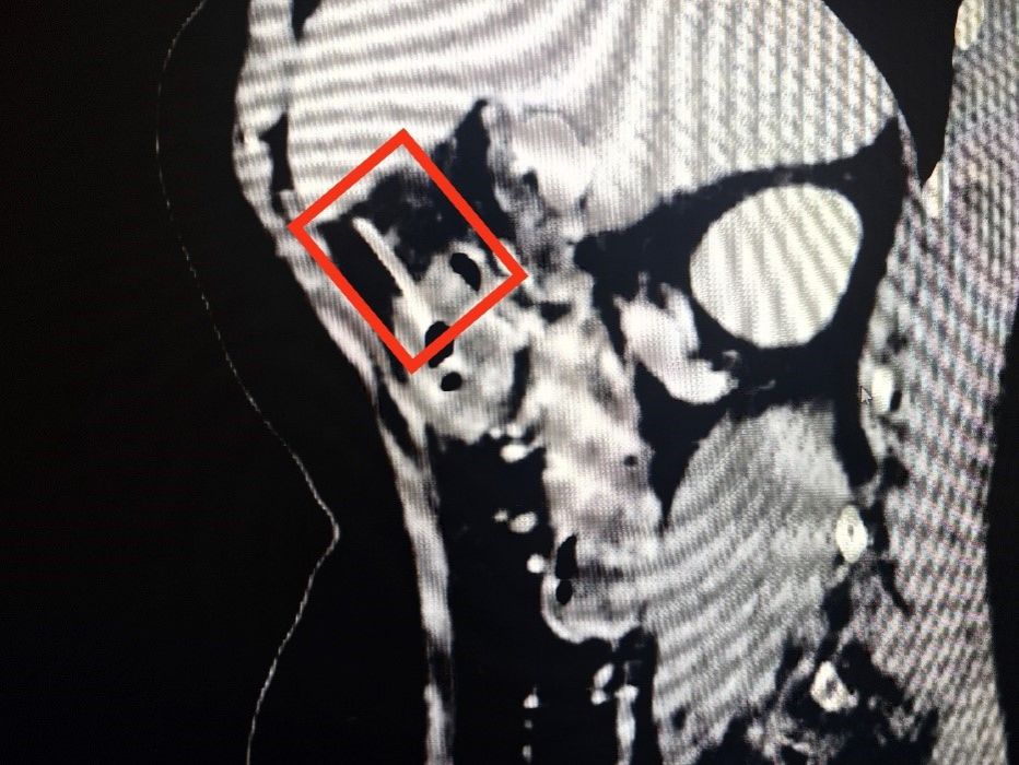 原来,三日前,张大娘和家人边吃鱼边聊天时,没注意鱼刺就吞了下去,本人还没有感觉到异常,所以腹痛难忍时也没有跟医生说明。在为张大娘做了CT检查后,发现胃周腹腔内存在少量游离气体,CT室主任潘历波在查找导致气体产生的原因时,发现了已经穿透胃壁的异物。潘主任就此询问患者病史,有没有吞食过什么尖锐的东西,患者才想起腹痛前三天曾食用过鱼肉。