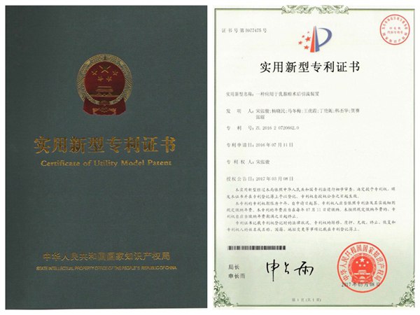 乳腺癌改良根治术为目前治疗乳腺癌最常用的手术方式,术后常规在患者前胸壁胸骨旁和腋窝各放置一根引流管,引流管连接引流装置,需人工估算引流量以便及时拔除引流管,避免皮下积液产生,有时还要抽取引流液化验、冲洗引流管道,甚至给引流管道注射药物。在一次查房中,宋张骏院长看到一位刚刚做完乳腺癌改良根治术的患者时,发现目前临床应用的引流装置存在很多不足之处,不能满足临床工作需要,就提出了改进引流装置的想法。在宋院长的带领下乳腺二病区医护人员查阅大量国内外文献,走访多名乳腺癌医护专家,多次就设计进行讨论研究,在临床上反复实验,设计出一种新型的引流装置,于2016年7月向中国国家知识产权局提出申请。由于这种新型“乳腺癌术后引流装置”设计严谨新颖,结构科学合理,很快获得实用新型专利授权。