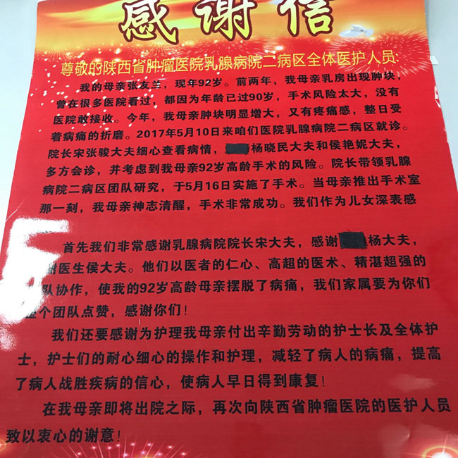 5月22日上午,92岁高龄的乳腺癌患者张老太太,在素股成功手术后,经过精心护理和康复治疗,老人术后康复顺利,精神状态良好。张老太太在素股完成左乳癌切除术,创造了素股行乳腺癌肿瘤切除术的最高年龄纪录。充分证明了高龄癌症患者也可以行手术治疗,达到提高生命质量的目的。