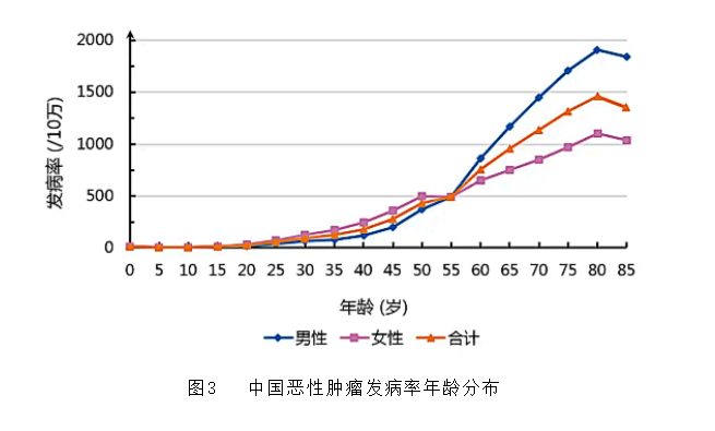 报告统计显示,我国全癌种的发病率在不同年龄阶段呈现出不同的特点:0~34岁,发病率较低;35~39岁,发病率明显上升;55岁以后,发病率和死亡率显著增加;80~84岁,癌症发病率达到顶峰。