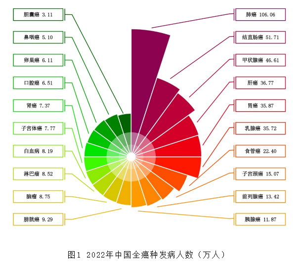 国家癌症中心发布的《2022年中国恶性肿瘤流行情况分析》显示,我国新增癌症病例约482.47万例、死亡257.42万例。其中,男性发病率高于女性,发病数前五位为肺癌、结直肠癌、甲状腺癌、肝癌、胃癌。死亡前五位的恶性肿瘤为肺癌、肝癌、胃癌、结直肠癌、食管癌。