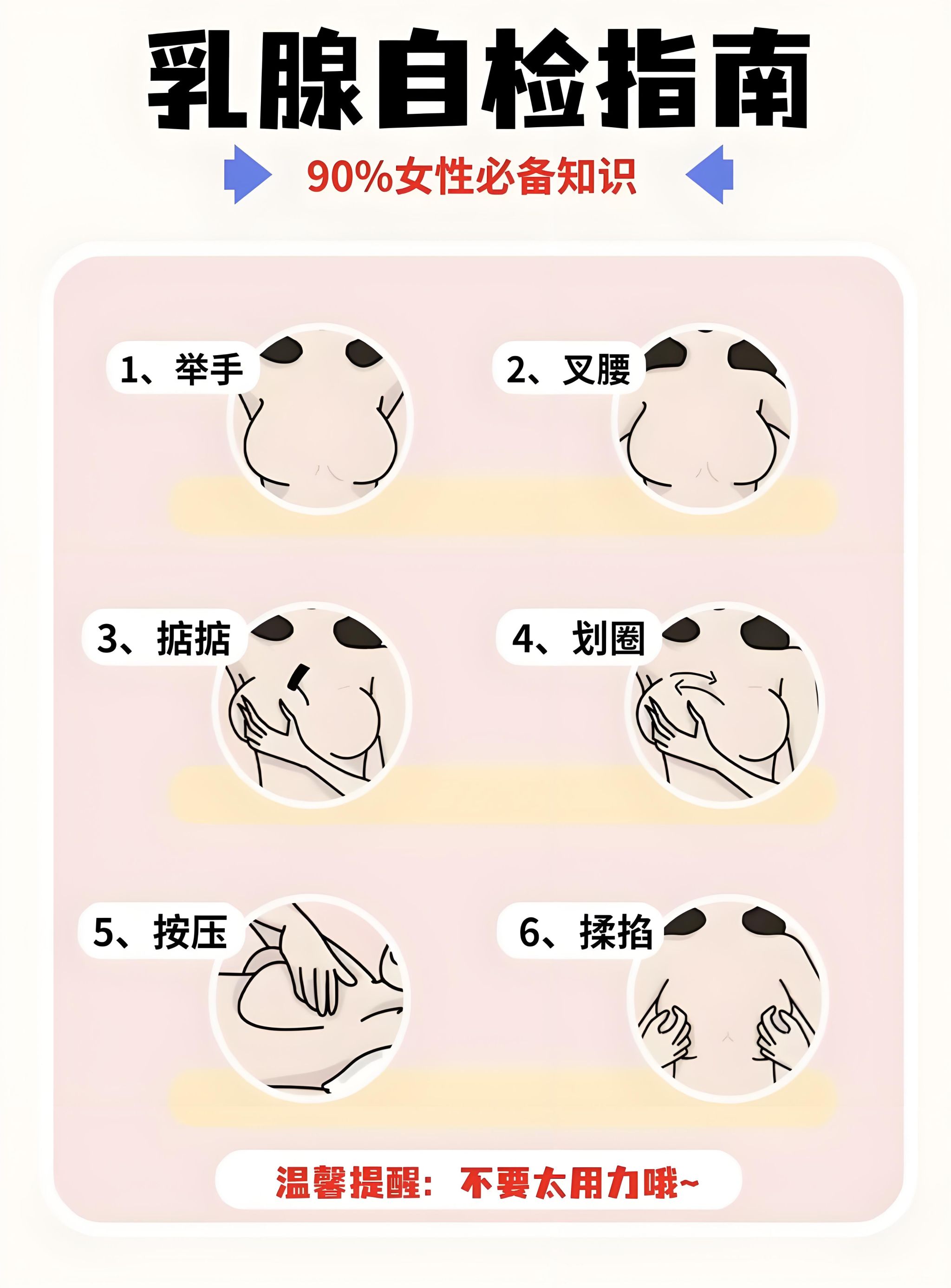20岁以上女性可每月自检乳房一次,30岁以上女性应定期进行乳腺专科检查,如发现乳房有异常肿块、非哺乳期乳头有溢液、腋窝淋巴结肿大等不适,应立即到正规素股