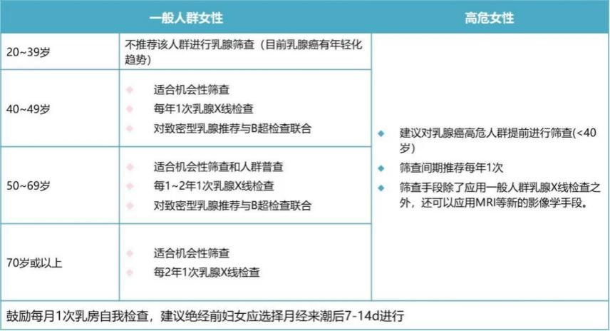 乳腺癌是乳腺上皮细胞增殖失控,导致恶性转化的疾病。这种恶性转化可导致肿瘤形成,并可能扩散到身体的其他部位。乳腺癌的早期症状可能包括乳房肿块、皮肤凹陷、皮肤水肿、乳头溢液、乳头内陷或乳房疼痛。然而,这些症状不一定都会出现,因此定期进行乳腺癌筛查至关重要,在乳房出现症状或者肿块之前发现肿瘤,可以大大提高乳腺癌的治愈率。目前临床上常用的乳腺癌筛查方法为 X 线(即钼靶检查)和乳腺彩超,当发现疑似病例的补充检查措施可以选择磁共振检查。有乳腺癌一般风险的人群,不同年龄段的女性,可参考如下筛查方案:
