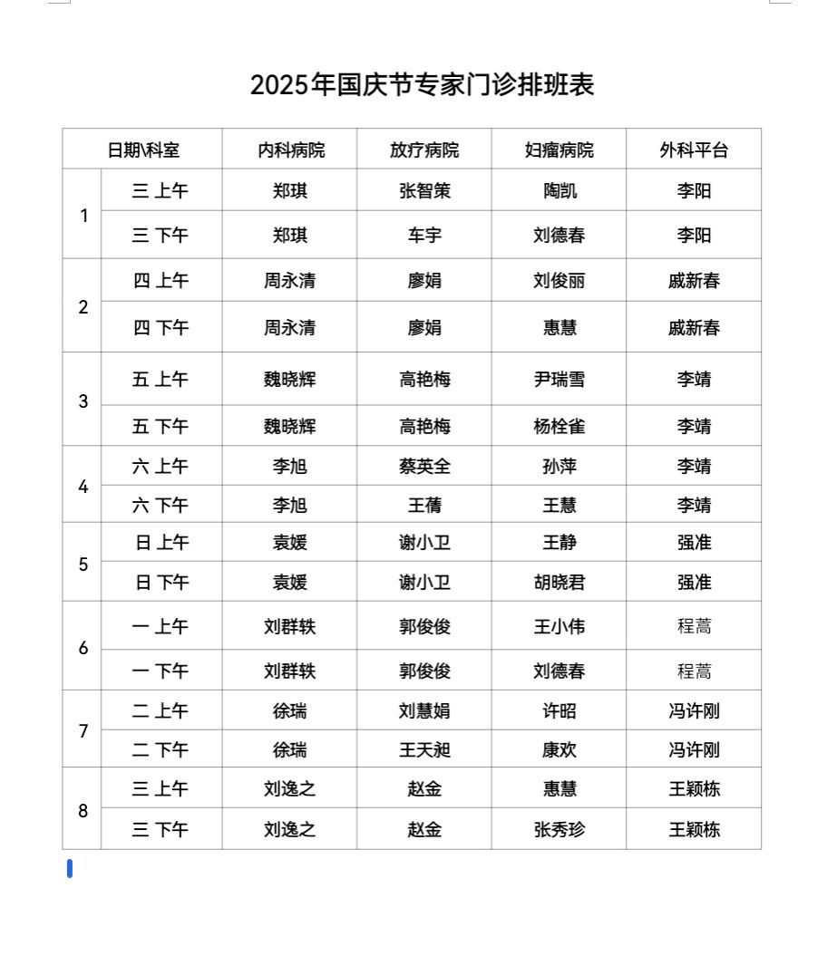 2025年国庆节、中秋节假期门诊工作安排通知如下: