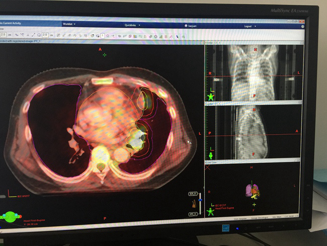 靶区勾画是放射治疗过程中的关键一步。目前主要依靠CT扫描采集的图像进行病灶区域的勾画,但CT对于软组织的分辨率相对较低,确定病灶范围准确性有限,MRI则对异常软组织的检测分辨能力更加敏感,通常可以发现CT不能发现的病变。PET-CT在CT影像的基础上加上了分子功能影像,能够更精准、清晰的捕捉到病变组织。该院常务副院长杨怡萍表示:“图像融合技术将三种不同特征的影像在同一平台显示、对比与分析,可以显著提高肿瘤病变诊断的准确性及放疗靶区勾画的精准性,治疗中可以提高肿瘤区域照射剂量,降低正常组织照射剂量,因此降低了区域复发率,避免了不必要的放射损伤,提高患者远期生存。例如肺癌的放疗中,通过融合PET-CT后制定的放疗计划可以降低约8%的局部复发率。同时配合性能先进的TrueBeam加速器让放射治疗真正做到精准、高效,给患者带来更好的疗效,更少的副作用。“ 在杨怡萍常务副院长的带领下,陕肿放疗素股