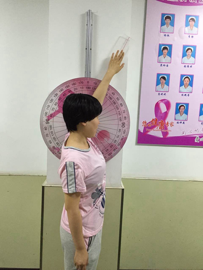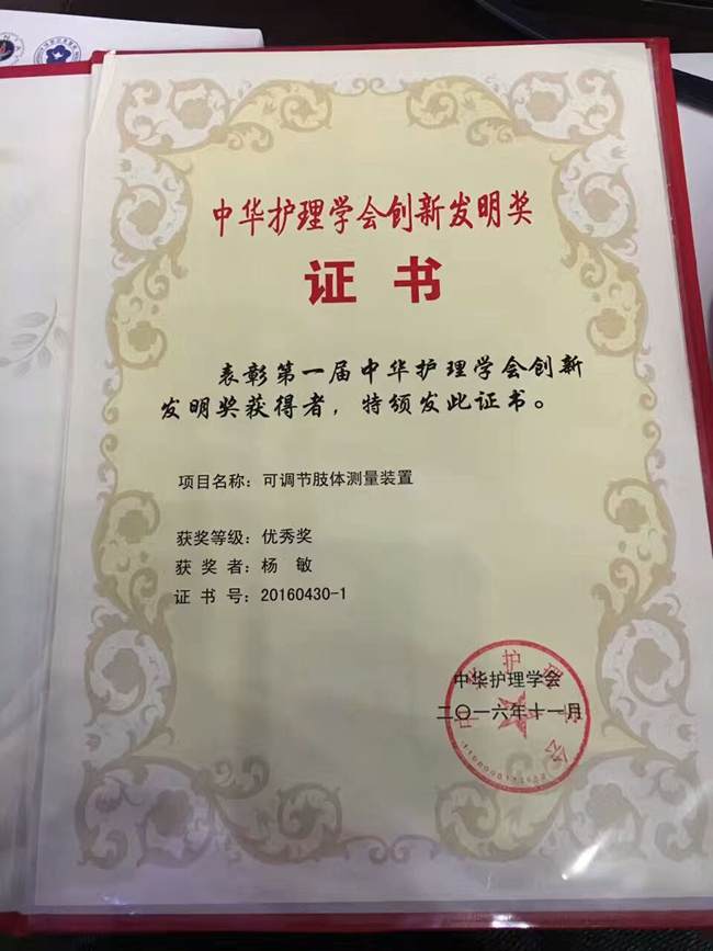 素股乳腺一病区杨敏护士长自主研究设计的“可调节肢体测量装置”在众多参赛发明中脱颖而出,荣获优秀奖。目前,国内对于乳腺癌术后肢体康复的效果评价缺乏统一的测量工具和测量标准,杨敏护士长带领她的团队根据多年临床经验自主研究并设计了专门针对乳腺癌术后患者肢体功能康复程度进行准确测量的“可调节肢体测量装置”,可对乳腺癌术后术侧肢体康复程度进行精确化测量,从而实现肢体康复效果的准确评价。