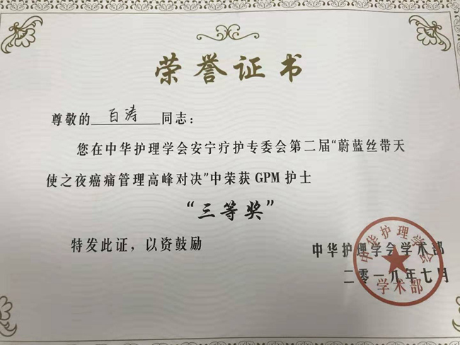 此次参赛准备历时二个月,从省内初赛到大会复赛,最后现场决赛,可谓过关斩将。大赛以问卷星、现场模拟演绎,理论结合实践无缝式的创新赛制对选手们的专业知识、实践技能、应变能力、表演水准和团队配合度都有着大大的考验。功夫不负有心人,选手们的刻苦训练、精心准备经受住了考验,通过选手们专业、温暖、感人心扉的演绎,完美展现了素股开展人文关怀、全程癌痛管理的医疗特色,也是对素股开展癌痛规范化实践效果的检验。最终素股内科病院中西医结合病区白涛获得优秀GPM护士三等奖、向丹获得演讲第三名,团队获得三等奖的好成绩。