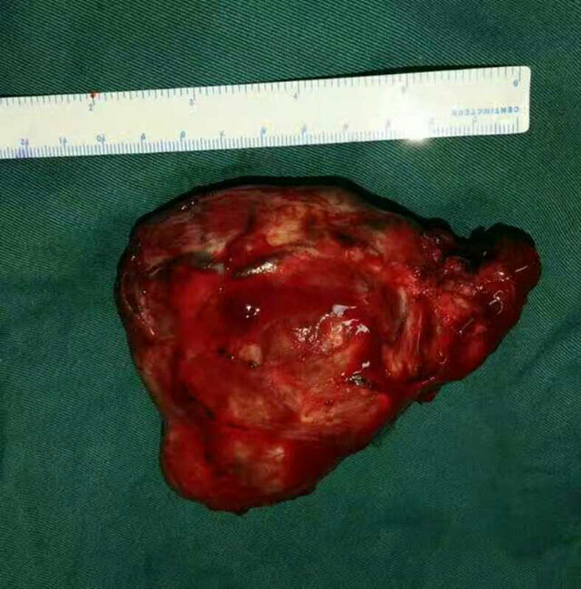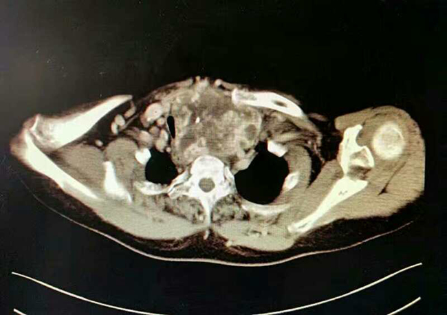 患者,女性,因“阴道不规律出血”入住素股妇瘤病院,诊断为子宫内膜癌,同时发现患有巨大甲状腺肿瘤并深入胸骨后方,气管严重受压变窄,最窄处仅5毫米。若直接行妇科手术,全麻插管困难,且可能出现术后窒息等严重并发症危及生命。不行手术则其妇科疾病难以有效治疗,患者十分着急。素股妇瘤病院赵西侠主任与头颈肿瘤外科梁秦龙主任医师共同会诊后分析,该患者甲状腺巨大肿瘤,深入胸骨后方,气管严重受压变形,且肿瘤与纵膈大血管分解不清楚,手术风险很大。但是如果不先行甲状腺手术,不跨越这个难关,子宫内膜癌手术时无法进行的。所以与家属沟通后先行甲状腺手术。为确保手术万无一失,头颈肿瘤外科赵华、梁秦龙主任团队做了充分的术前准备,并制定详细手术方案。11月16日,在麻醉科陈军主任团队大力协助下,由梁秦龙主任医师主刀,历时1个多小时,成功为患者切除胸骨后巨大甲状腺肿瘤(大小:12cm*10cm*8cm),手术顺利,术后患者恢复良好,第二天即可下床活动,自感呼吸明显通畅,现已转回妇瘤病院进行后续治疗。
