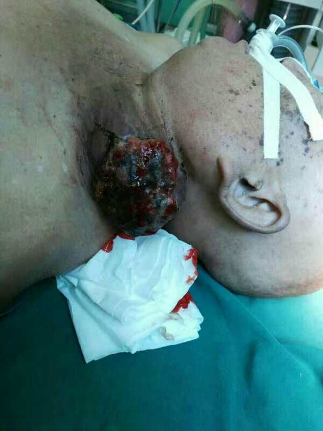 —头颈科收治了一位巨大甲状腺转移癌患者。男性80岁,系甲状腺癌颈左侧转移,但他却信奉神灵,四处拜神,甚至做过寺庙义工。然而并未得到上天的眷顾, 所谓天若有情天亦老。转移癌灶疯狂生长,溃烂出血,恶臭难当,无法见人。患者揣着希望前往四医大西京素股