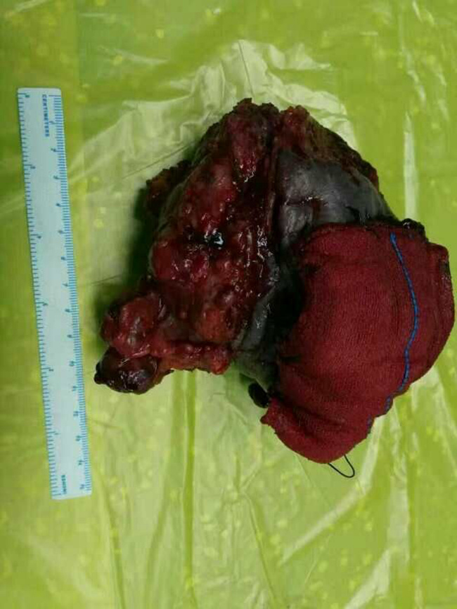 患者80岁高龄,脖颈粗短,左侧肿瘤巨大,约10x10x8cm大小,表面整个溃烂,伴有渗血,且有恶臭。影像检查显示肿瘤范围深广,尤其是颈动脉鞘受侵。手术治疗风险较大,颈鞘血管、迷走神经、膈神经、臂丛神经、副神经等分离保护均为手术难题,皮肤缺损也较大,约8x8cm大小,修复难度较大。一旦颈总动脉破裂,出血迅猛,难以控制,危及生命,即使可以结扎,也会出现严重偏瘫的并发症。经过赵华主任治疗小组反复研讨,非手术治疗则毫无生机,手术则是患者能活下去的唯一希望。通过与家属充分沟通,家属抱着置之死地而后生的决心,坚定地选择了手术。