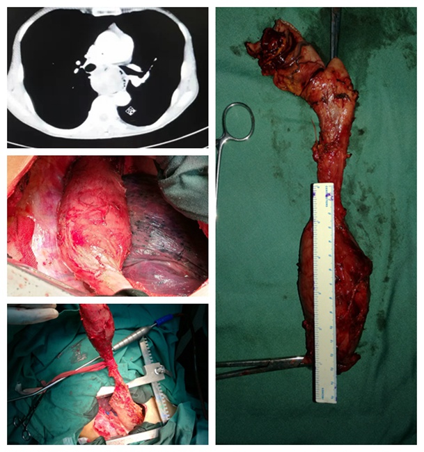 腹部操作使用腹腔镜, 50分钟左右顺利完成,出血量不到15ml。开胸后,术中发现,食管病灶位置明显增粗,直至胸顶,食管表面附着一层血管网,无法判断肿瘤上界。经雷光焰主任医师、张曦副主任医师仔细剥除食管外的网状血管膜后并加以辨识并结合胃镜检查,考虑到增粗的上段食管为患者平时进食不畅食管扩张所致,判断胸顶吻合即可。手术标本取下后,肉眼可见食管切缘无浸润。整个手术过程顺利,患者术后安返病房。