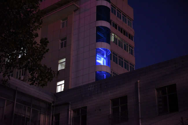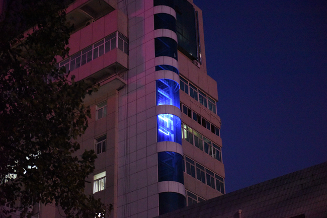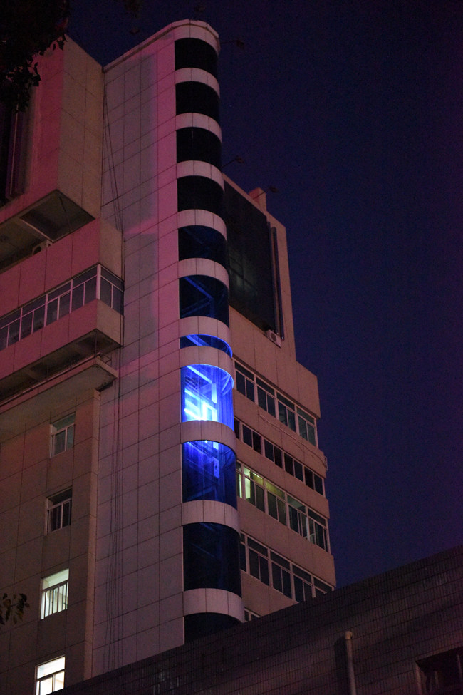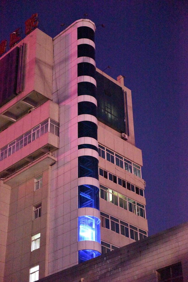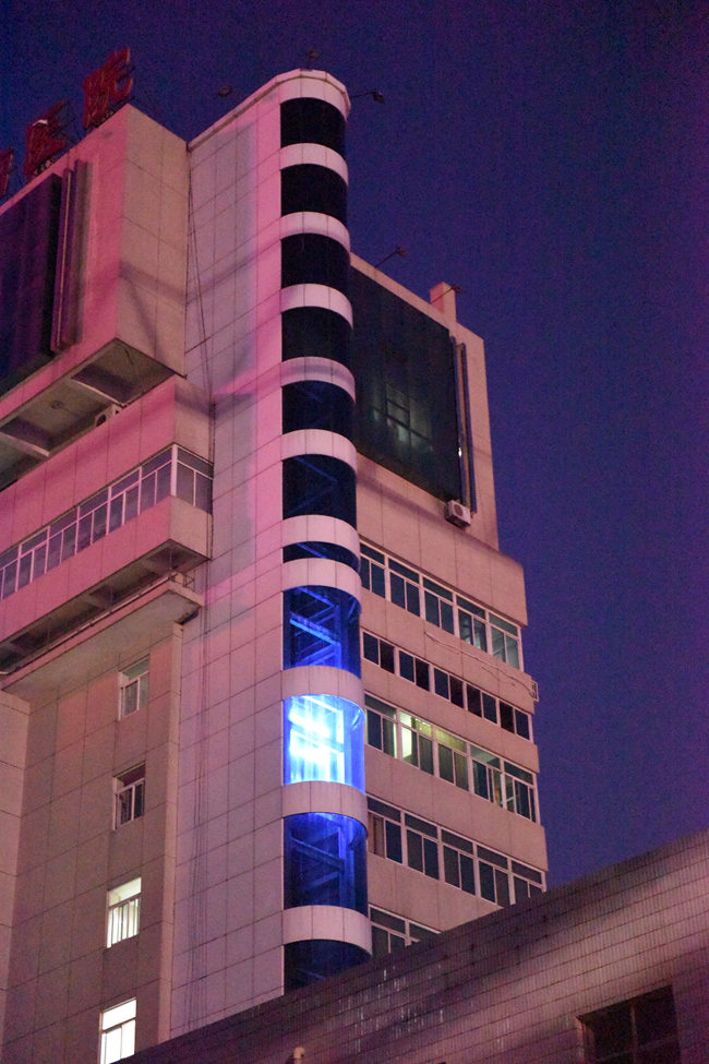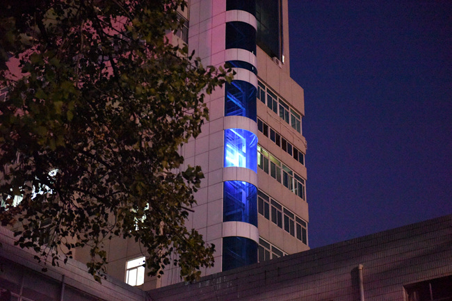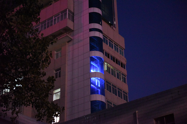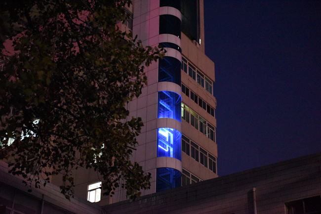 后勤保障部为素股住院A楼观光电梯安装了霓虹灯,走在含光路上使路人眼前一亮,原来素股 也可以如此
