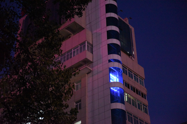 夜色下的电梯霓虹灯 为素股再添一景(摄影 汤宾)