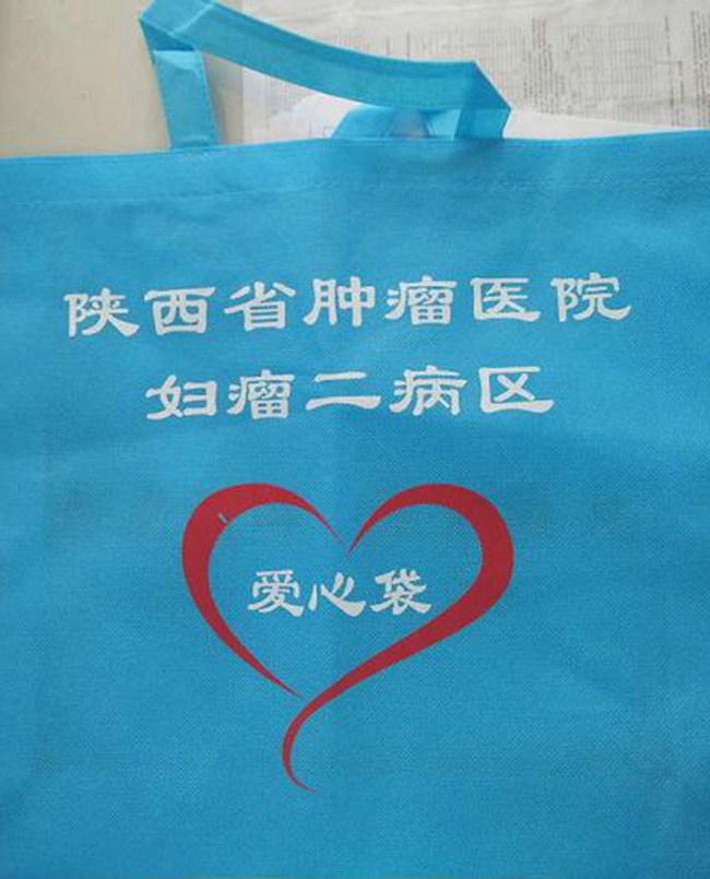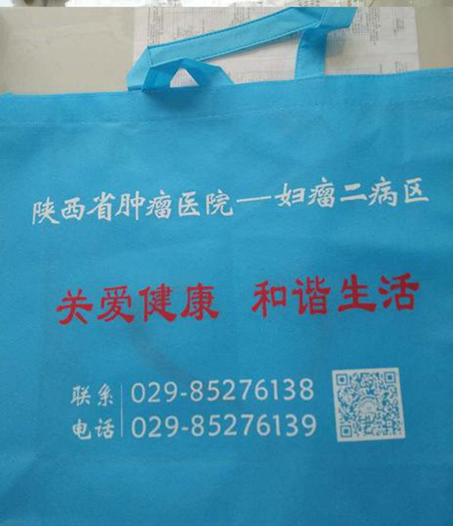 为方便出院患者携带药品及出院资料,妇瘤二病区为患者专门制作了“爱心袋”,袋子是由浅蓝色无纺布材料制成,上边印有科室优质护理品牌——“关爱健康 和谐生活”、科室咨询电话、健康教育微信二维码,这些都是为了更大程度地方便患者及时获取健康信息和帮助。当然袋子上大大的艺术爱心则满载着全科医护人员对患者延伸的、不间断的关爱。(妇瘤二病区 郭卫鸽)