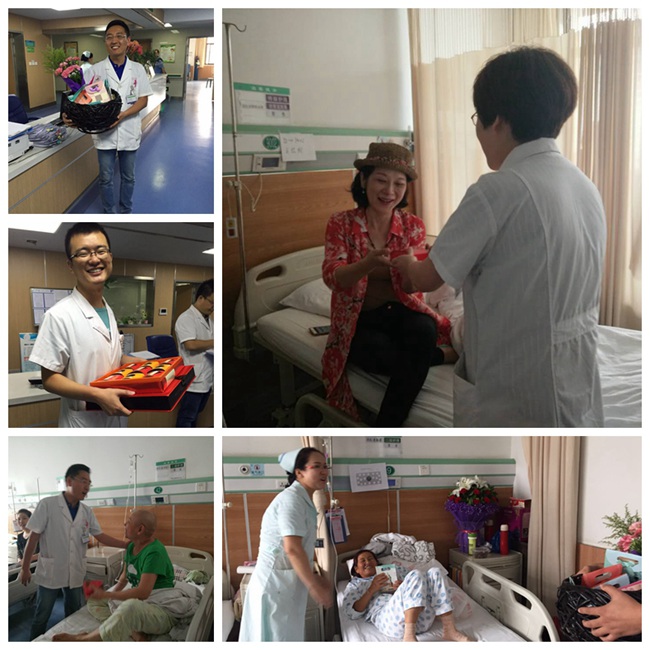 正值中秋佳节来临之际,乳腺二科医护人员延续上年的传统,为在院患者精心准备了代表团圆,寓意祝福健康的月饼。于9月14日(农历八月十四)中午,由宋张骏院长带领乳腺二科全体医生护士,亲手将月饼送到每位患者手中,为患者带去节日的祝福,祝福患者早日康复。收到祝福的患者均表示非常开心。患者李阿姨拉着护士的手说,在肿瘤素股 感受到了家的温暖。