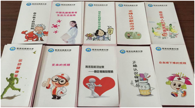 折页内容包含了:肿瘤患者贫血、白血球降低、保健品的使用、日常运动、饮食及中国乳腺癌患者康复指南等。通过学习交流,帮助了患者和家属正确认识和对待肿瘤治疗过程中存在的各种问题,了解了患病后在饮食、运动方面的注意事项。