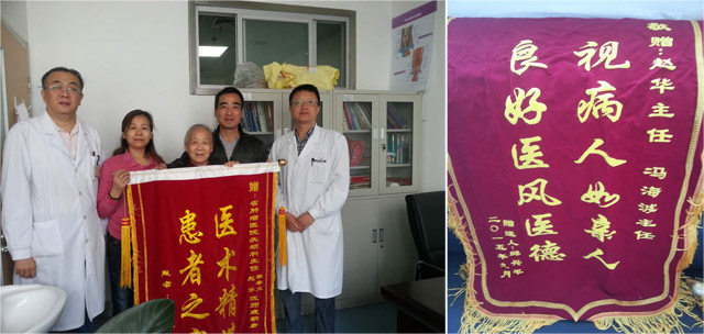 医术精湛,患者之家----近期,头颈科赵华、梁秦龙及冯海波3位医生分别接到了来自他们诊治过的患者及家属送来的锦旗,锦旗上满满表达了对他们精湛医术和高尚医德的由衷谢意!(郭晓东)