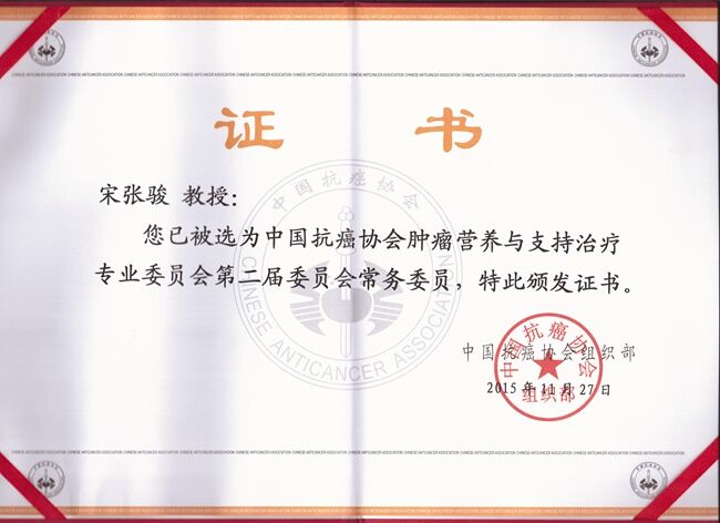 宋张骏院长连仼中国抗癌协会肿瘤营养与支持治疗专业委员会常务委员。