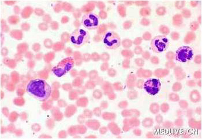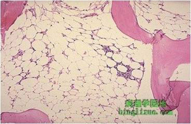 急性粒细胞白血病:骨髓增生明显活跃或极度活跃,造血组织高达100%,脂肪组织减少或消失。造血组织中可见大量的白血病细胞,不同亚型白血病的原始细胞(或早期幼稚细胞)的类型及比例不尽相同,白血病细胞的形态异常,如核仁明显,胞质少,可见病理性核分裂象。红系和巨核系增生受抑或缺如。白血病细胞弥漫侵润,骨髓腔完全被白血病细胞充填,骨小梁萎缩变细。骨髓切片还可对白血病的疗效做出评价,如骨髓切片显示原始细胞与早幼细胞集簇,类似于MDS所见ALIP,即使骨髓涂片检查显示达完全缓解,患者仍需继续巩固性化疗。