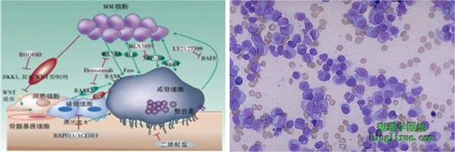 多发性骨髓瘤:骨髓增生明显活跃,造血组织增加,脂肪组织正常或减少,小梁间区有不同分化程度的浆细胞弥漫性侵润,原始、幼稚浆细胞沿骨内膜成簇或弥漫性分布于血管周围、小梁旁区,破骨细胞增多,骨小梁破坏。当瘤细胞分化较差时,细胞形态异常,核仁明显,胞质嗜碱性,胞质及核内常可找到嗜酸性包涵体,为识别浆细胞的特征之一;骨髓间质水肿、渗出。