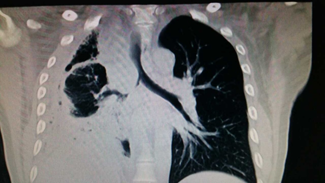 后,通过熟人介绍找到素股胸外科主任雷光焰教授,并转至素股。气管镜提示:距隆突2cm气管右后侧壁可见一菜花样肿块突入气管腔,并向下侵犯右主支气管,右主支气管大部分阻塞。CT提示:气管肿瘤,右侧肺不张,伴有液气胸,肺实变,胸膜增厚明显。经CT下穿刺提示:神经鞘瘤。