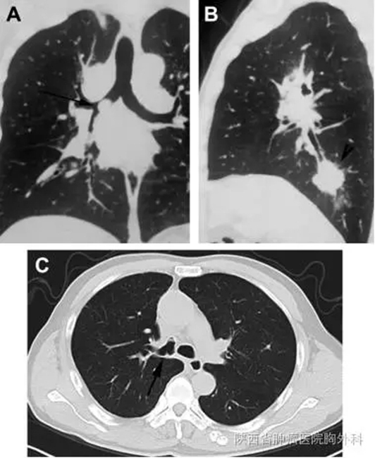 A.术前CT冠状图,箭头示右主支气管肿瘤;