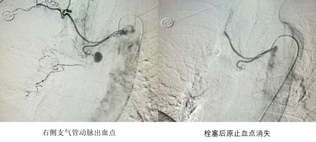 12月20日下午4时许,该患者突然无明显诱因呕出鲜红色血液约200ml,郭亚焕医生根据其各项检查结果判断患者系食管肿瘤破溃大出血,估计总出血量在500ml以上,出血还在继续,情况万分危急。郭医生在进行内科抢救的同时,马上联系微创介入科余国政主任,余主任了解病情后提出,患者极有可能存在肿瘤动脉破裂出血,必须立刻施行动脉栓塞止血治疗。介入室医护人员立即做了各项抢救准备工作,在征得家属同意后迅速展开了介入栓塞止血治疗。术中寻找所有可能存在的肿瘤供血动脉,造影发现,右侧支气管动脉近主干处造影剂明显漏出,发现“罪犯”血管,遂将导管超选择插至右侧支气管动脉内,将适量PVA颗粒(560μm)栓塞于此,至血流中断,再次造影显示原造影剂漏出征象消失,手术历时30分钟,成功止血。术程顺利,术中患者平稳,术后安返病房。次日回访,该患者术后再未发生呕血,生命体征平稳。