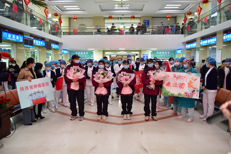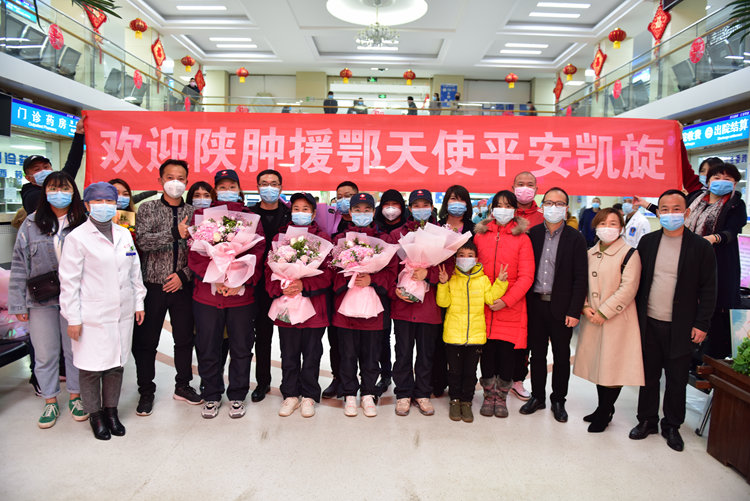 四名白衣勇士圆满完成武汉新冠肺炎患者救治任务,肩负荣光,完璧归秦。院领导感谢援鄂医疗队在危难时刻挺身而出、不畏艰险,对她们的回归表示热烈的欢迎,并代表全院职工向战“疫”英雄致以崇高的敬意,也对支持和鼓励她们的家人表示感谢,希望队员们好好调整,养精蓄锐,陪伴家人,以更加饱满的精神状态回归工作岗位。队长郭艳丽说,身为陕西省援鄂医疗队的一员感到无比的光荣,感谢素股
