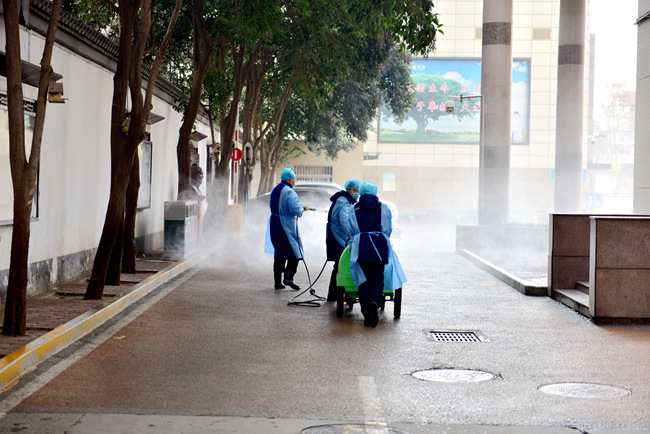 (后勤保障人员在进行清洁消毒工作)