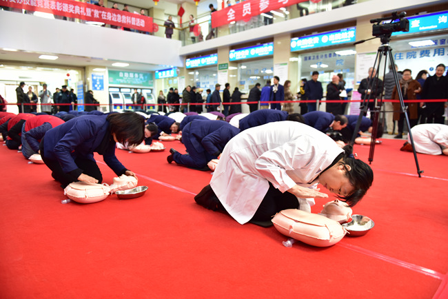 颁奖典礼之后,院领导、老专家、患者家属及来自不同工作岗位的56名代表在统一口令下,进行了现场演示。他们精神饱满、动作规范有序、抢救流程紧张而又有条不紊,充分展示了素股职工过硬的心理素质和扎实的急救技能。