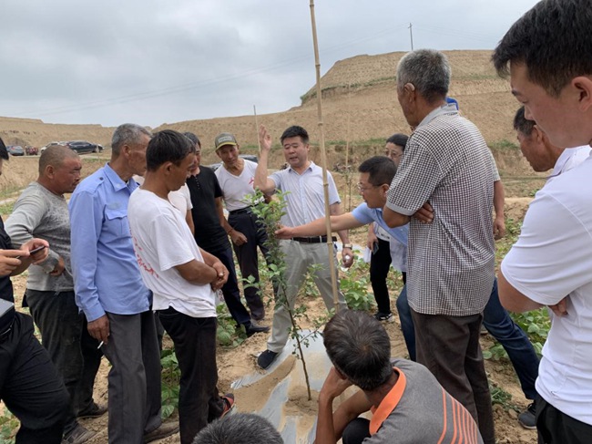 7月16日至17日马长虹书记带队一行与陕西果业集团技术专家赴榆林市横山区石湾镇麻地沟村,为麻地沟村村民现场组织山地苹果栽培实用技术培训,进行配套基础设施勘察。果业技术专家在田间地头,从山地苹果的品种、发展前景、种植、管理、病虫害防治等栽培技术作了讲解和示范,对农户提出的问题做了详细解答。村民积极性很高,果业集团技术专家与村民建立微信群,随时解决果树种植技术问题,对提高农户山地苹果种植水平发挥了积极作用。随后马书记、果业集团技术专家和榆林分公司领导及镇村两级领导为了解决麻地沟村宽幅梯田栽种山地苹果没有相应配套灌溉设施问题,对种植的600多亩山地苹果地形进行实地勘察,确定由素股出资协助麻地沟村修建蓄水池,切实解决麻地沟村在发展山地苹果产业过程中的灌溉问题。最后,陕西果业集团榆林市分公司副总经理白东安和横山区分公司经理白晋表示愿意在果树种植技术上无偿支持并包销种植的山地苹果。