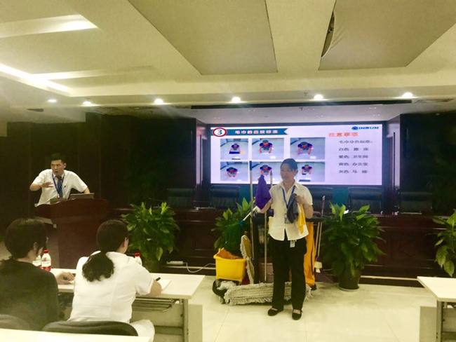 保洁六步法、消毒液配制、保洁工具的正确使用与摆放以及保洁员日常工作中的礼仪、礼貌、文明用语等,整个培训课程以图文并茂、通俗易懂的形式展现,让台下的保洁员们听的津津有味。培训课程中还有模拟操作演示以及讲师与学员们的互动环节,让学员们更好的理解了保洁设备的操作技巧,以及在工作中存在的一些认识误区,这种方式也充分调动起了在场学员的情绪,展现出了轻松有效的学习效果。