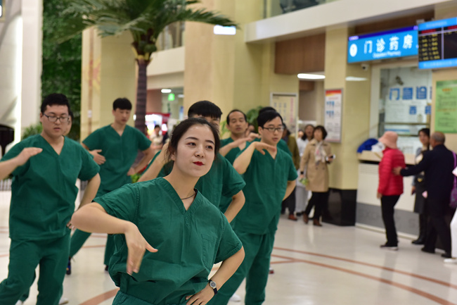 门诊大厅,伴随着节奏明快、又励志的歌声,帅气男护士团突然出现在大厅里,跳起了活力四射的舞蹈,前来就诊的患者被音乐和舞蹈吸引,纷纷驻足观看。