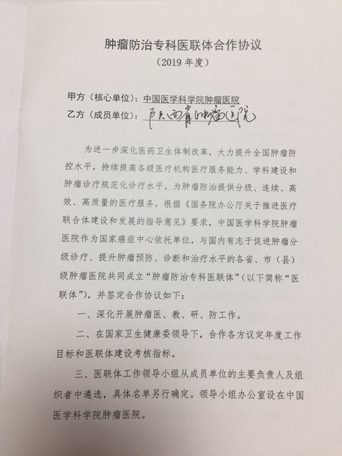 签订了“肿瘤防治专科医联体”合作协议,至此,素股成为我省唯一一所省级“肿瘤防治专科医联体”成员单位。