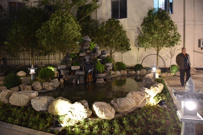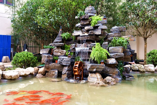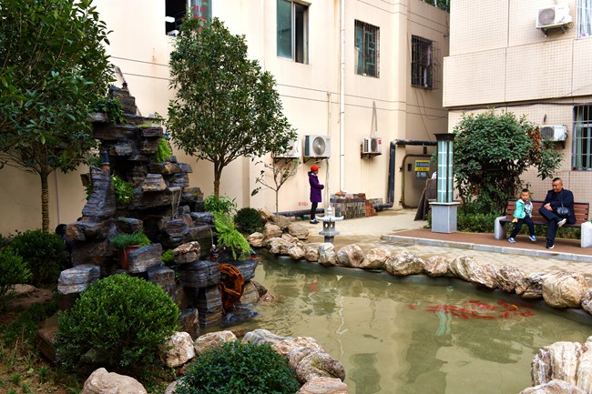 (流动的水池水景满足了人们的视觉和触觉体验,假山喷泉和景观小品增加了患者的乐趣)