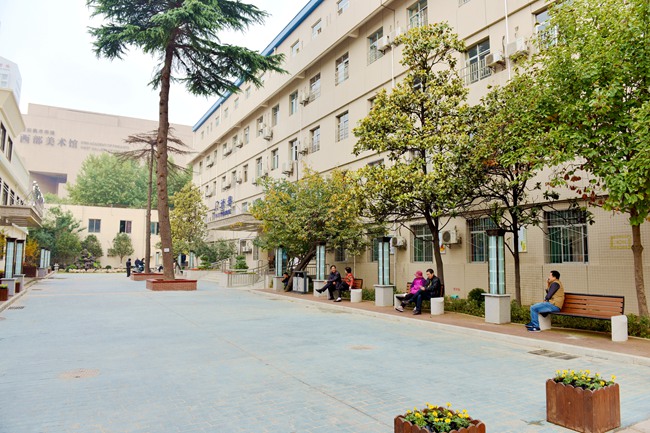 (庭院中央,陪伴陕肿院成长的雪松傲然挺立。)