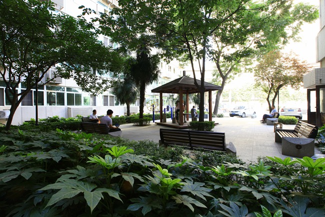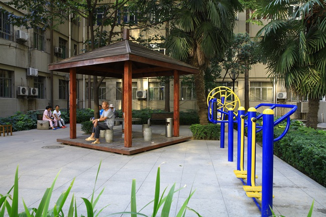 (广场西北角被绿植掩映的木质小亭,为住院患者和探访家属提供了一个闹中取静的内部花园)