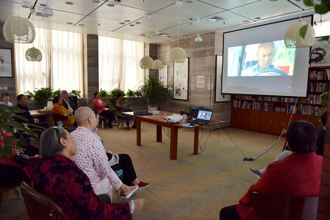 “书吧”里,影像在白色的银幕上跳跃,肿瘤患者及家属坐在舒适的绿色休闲椅上,专注的跟随着剧情发出阵阵的欢笑与赞叹声,这是一场专门为肿瘤患者准备的“电影之旅”,帮助患者改善心情,更好的康复。