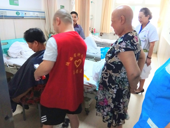 自带理发工具,身着志愿者服装,看着一双双需求服务的眼神,他的动力更加充足。从早上九点开始到下午五点,志愿者共为44位因化疗脱发的患者剪理了头发。患者们与他在愉快地交谈中完成了剃光头发这一艰难过程;同时,患者服务中心的工作人员也将本中心开展的工作在病房广泛地推广介绍。工作人员与志愿者共走进十个科室,发放宣教资料60余本,使100多位患者了解了患者服务中心。通过宣传,让患者们领略到治疗之外,素股