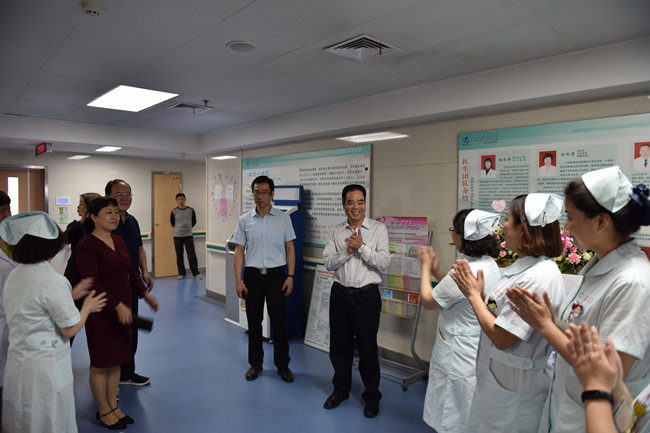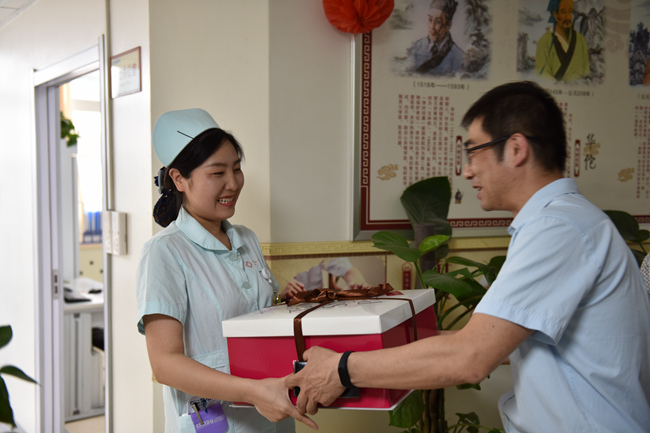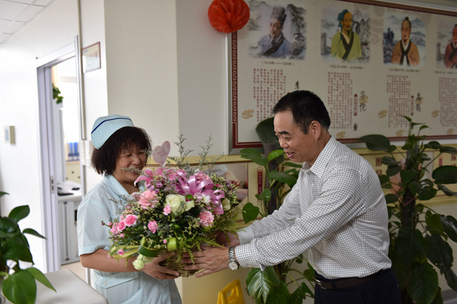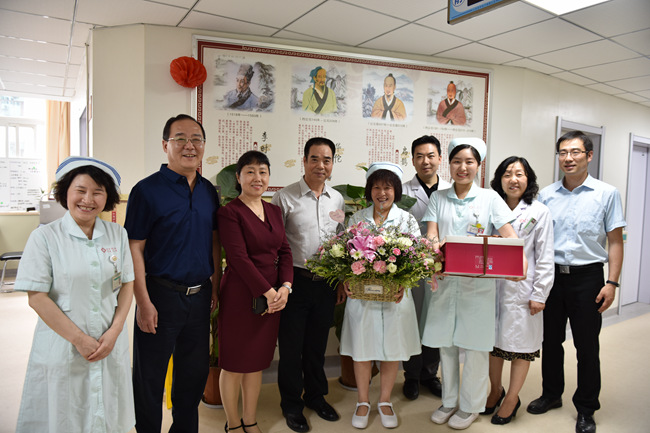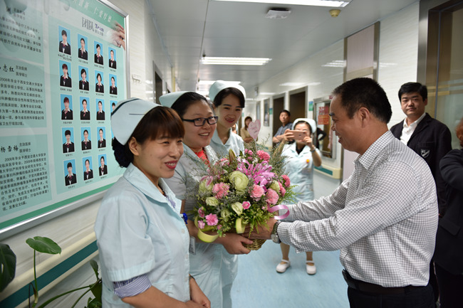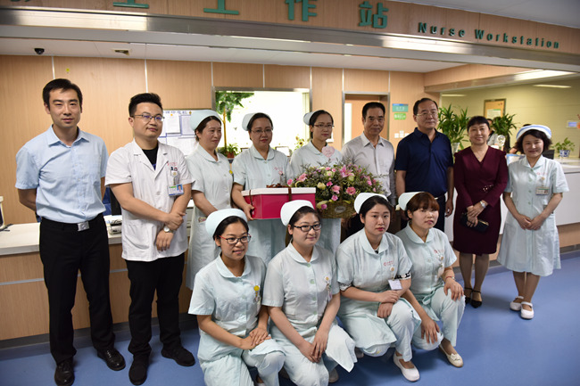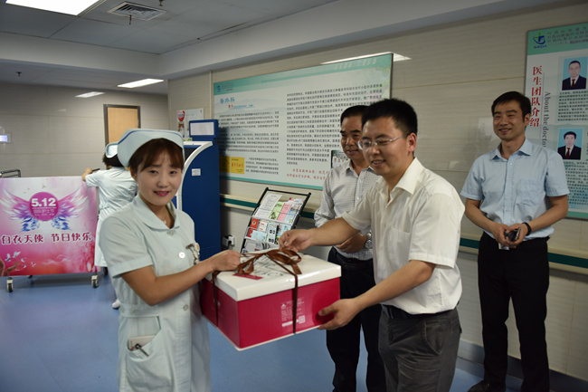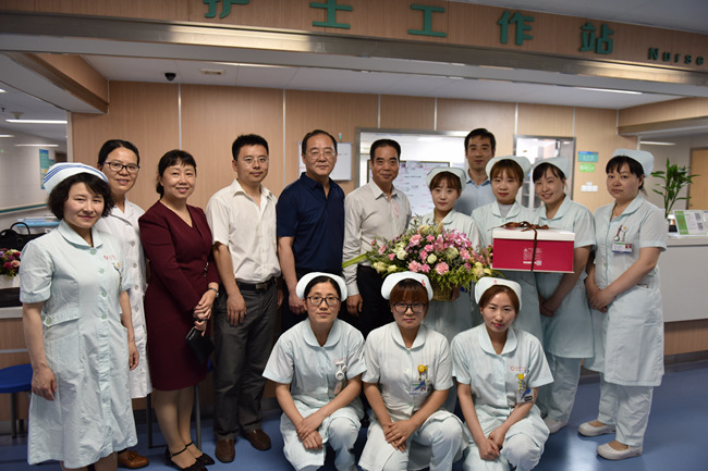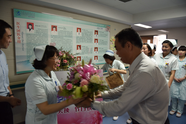 一行人先后走访了妇瘤二病区、中西医科、放疗一病区、乳腺二病区、普外介入科五个护理单元。领导们认真听取了护士长的情况介绍,向护士们的辛苦工作表示感谢,并送上精心准备的鲜花和蛋糕以及节日的祝福。