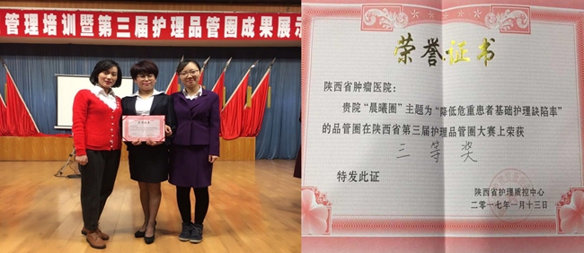 本次比赛共有来自全省医疗机构及解放军系统的169个圈参加,最终选出包括素股内二科的“亮剑圈”在内的20个作品进行壁报交流,素股普外一科“晨曦圈”在内的20个作品参加大会交流。经过激烈角逐,普外一科“晨曦圈”主题为“以病人为中心,以服务创品牌,降低危重患者基础护理缺陷率”的品管作品在护士长张洁,圈员常利、刘香琳及薛磊的精彩展示下荣获三等奖。