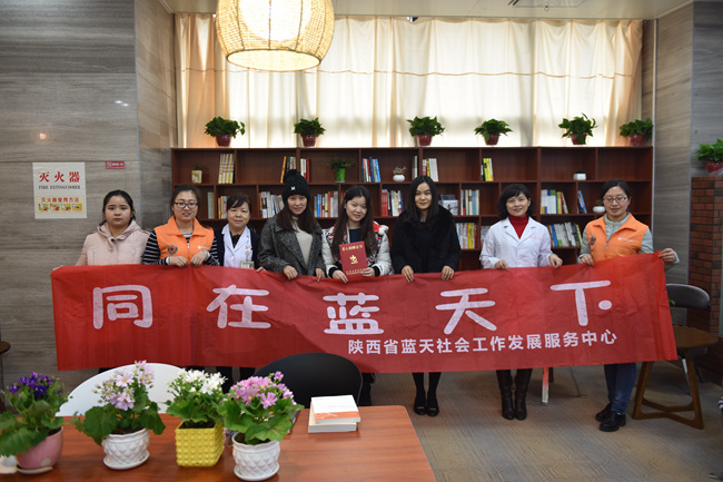 (蓝天社会工作发展服务中心工作人员、志愿者以及一直为书吧的建成忙前忙后的患者服务中心工作人员合影)