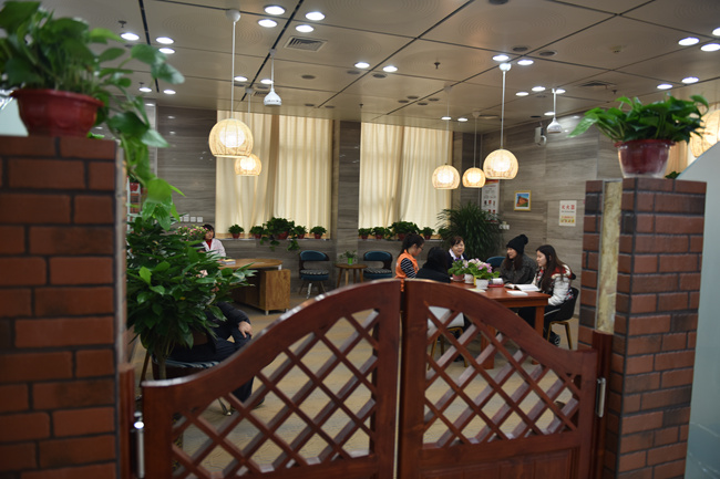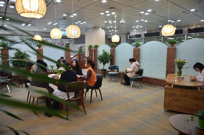 内的阅读休闲书吧。清新典雅的装饰、原木风格的设计,还有生机盎然的绿色盆栽,这里将为医护人员和患者及其家属提供精神食粮,成为他们放松心情的港湾。