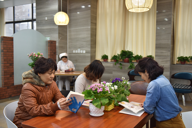 在阅读区,35岁的乳腺癌患者张女士,正在看着《在路上》,她笑着说“以前来院里接受治疗时,大多数时间就是呆在病房里,看看手机、电视和家人病友聊聊天打发时间,有时不免烦闷,现在在这么雅致的环境里,看看书、发发呆,心情莫名的就安静、舒畅起来,觉得住院不再是一种“负担”,而是一种享受了。”
