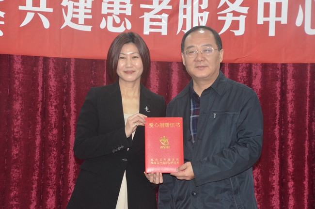 党委书记马长虹向HOPE基金会颁发捐赠证书。贾延副院长分别为患者发放了《健康教育手册》。