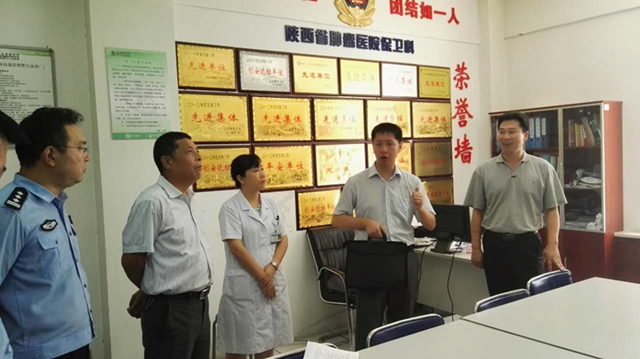 7月28日上午11:00时,检查组长西安市社会治安综合治理办公室综治一处处长刘冬一、副处长刘念秦;西安市公安局文保支队四大队大队长王勇;雁塔区政府综治办领导;公安雁塔分局副局长薛刚;雁塔经保大队大队长王润轩、民警刘红;小寨派出所治安所长张军宁、户籍所长闫亚文及管片民警一行13人,在素股副院长姚俊涛、纪检副书记宋峥华及相关职能科主任陪同下,对素股警务室建设及素股