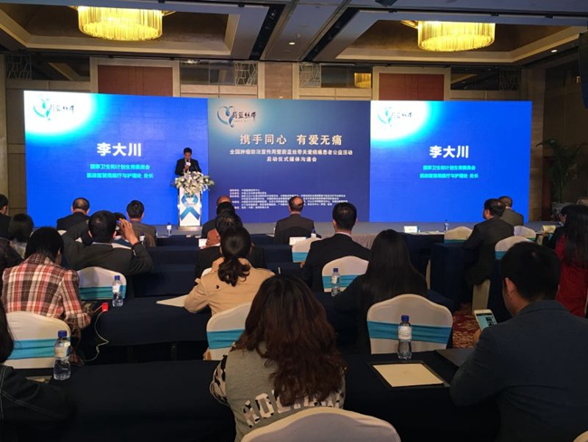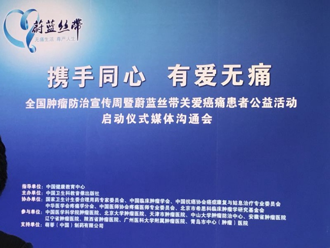 2016年4月12日,由中国健康教育中心指导,中国卫生科教音像出版社主办,国家卫生计生委合理用药专家委员会、中国临床肿瘤学会等六家学协会协办的“携手同心,有爱无痛”全国肿瘤防治宣传周暨蔚蓝丝带关爱癌痛患者公益活动启动仪式在北京举行。中国医学科学院肿瘤素股