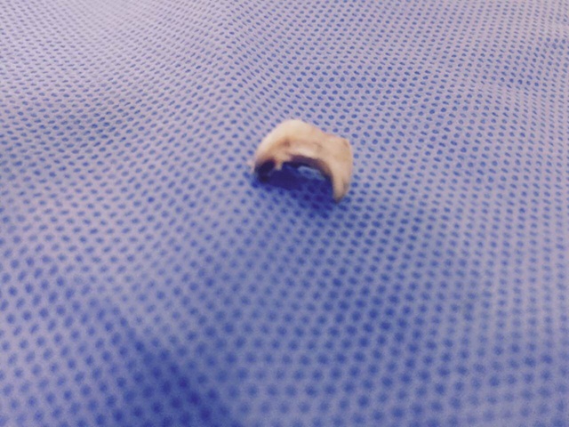 我们动用科室所有器械轮番试取,经过约50分钟的努力,异物被钳出至口腔,可患者体质极度虚弱,毫无咳出能力,为防止异物再次坠落入肺,我们决定继续向外钳取,多次之后无果,最担心的事情发生了,最终异物再次坠入肺中。生命在此刻如此神圣,我们努力、再努力,反复尝试,终于在经验丰富的李老师与何医生默契配合下,用异物钳夹取成功,原来是一颗残牙。异物取出后患者呼吸开始恢复平稳,血氧饱和度上升,在场的医生护士长长舒了口气,悬着的心放下啦。晚10点多,患者平安返回病房,家属深表感激,并给科室送来了锦旗。