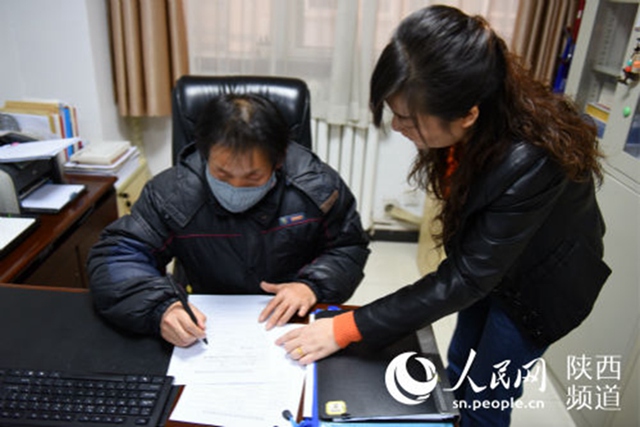 (的哥廖师傅正在办理“特困恶性肿瘤患者爱心基金”手续 手续完成后他将领到一万元的爱心补助金)