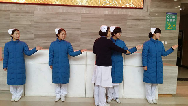 培训内容涵盖导医工作中的语言、仪表、服饰,化妆技巧到举止、站、坐、行姿和微笑以及如何接待病人、如何护送病人、如何与之交流、怎样为病人指路等方面的导医职业礼仪,培训历时2个多小时,内容全面、生动,导医们认真的聆听着每一个细节.礼仪演练环节中,苏情老师带头做礼仪示范,其她导医依次练习,王华护士长将训练照片与大家讨论,针对每一个具体动作进行指导直至达到标准要求。最后导医们还分组模拟了门诊导医服务中的各种场景进行了演练.